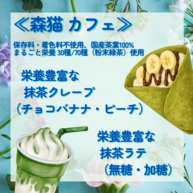 栄養価の高い国産高級茶葉100%、保存料・着色料不使用の一番茶(粉末緑茶)を使ったクレープやドリンクを提供します。